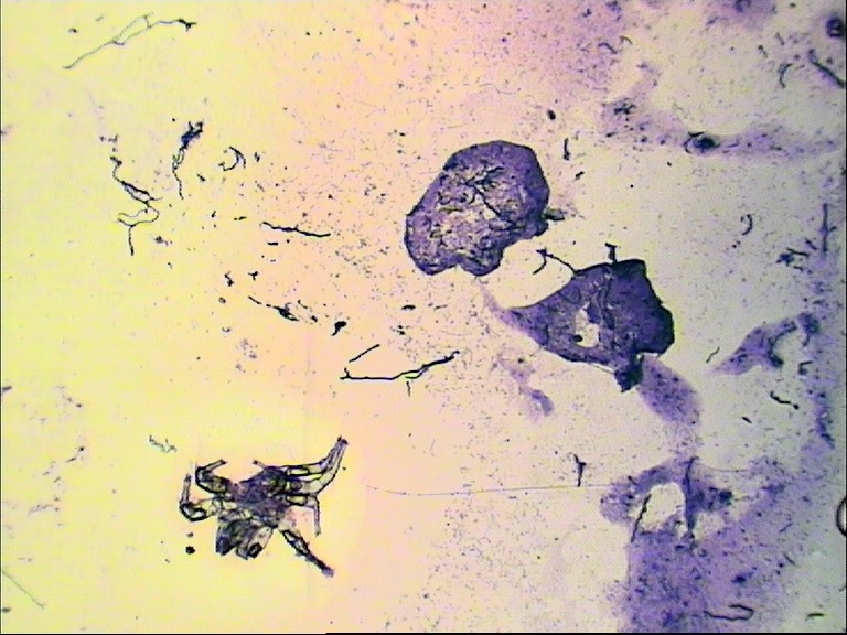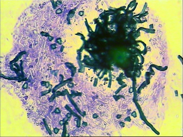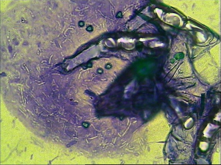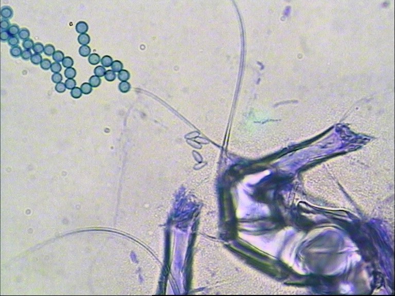 Bakterien reagieren weniger empfindlich auf die oberflächengebunden vorliegenden Biozide und / oder hohen pH-Werte und können sich in Feuchtigkeitsfilmen, die diese überschichten, wesentlich schneller vermehren als die immer zunächst substratgebunden auswachsenden Schimmelpilze. Durch bakterielle Verstoffwechselung gelöster Kohlenstoff-Verbindungen werden organische Säuren gebildet, die mit gelöstem Kohlendioxid eine für Pilze günstige Ansäuerung des Feuchtigkeitsfilms bewirken. Milben können sich von dem bakteriellen Biofilm ernähren und vermehren. Abgestorbene Milben wiederum stellen ein hervorragendes Biomassereservoir dar, welches bei anhaltend hohen Wasseraktivitäten von Pilzen zur Vermehrung und Koloniebildung genutzt werden kann. Auf dem bakteriellen Biofilm bildet sich sukzessive ein Wachstumsvorteil für Schimmelpilze heraus.